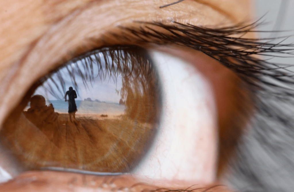 Hold on – this gets really cool! What this describes is that moment you look into someone’s eye, and their pupil (the apple of their eye) catches the light and reflects a mirrored image of yourself back to you. A “little man of the eye” … kind of like this: