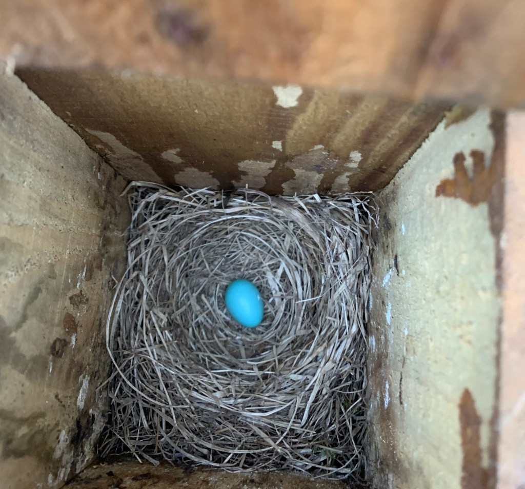 So this year, we have once again welcomed a pair of bluebirds, but I have watched them with different eyes this year – partly marred by last year’s “incident” and partly shadowed by the news reports from around the world. I watched them fly in and out with twigs in their mouths, laying a perfect home for their eggs. Days passed – we didn’t see “Podo and Nurgabog”, and wondered if they’d moved on. But then today – I walked out and checked again – and there it was!